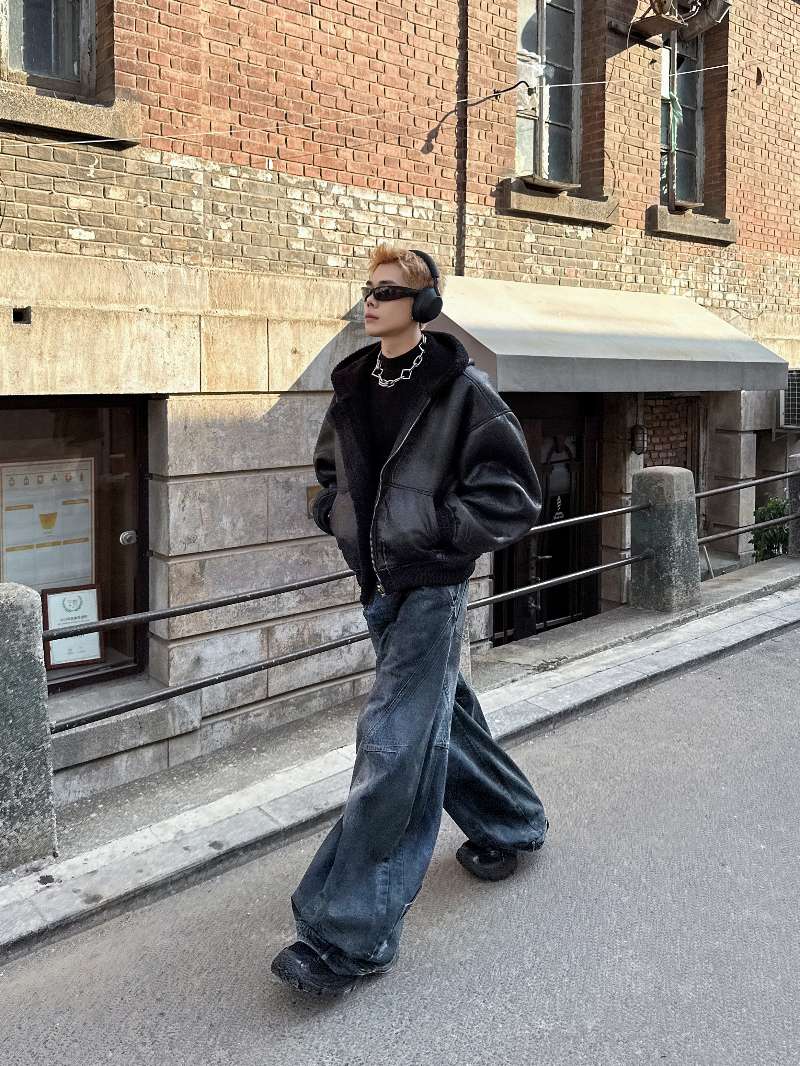 Fabric composition: 100% polyester Color options: black Product process: Can be worn on both sides, one side is leather, the other side is polar fleece Design highlights: Loose version design for comfortable and natural wearing, hooded design for warmth and fashion